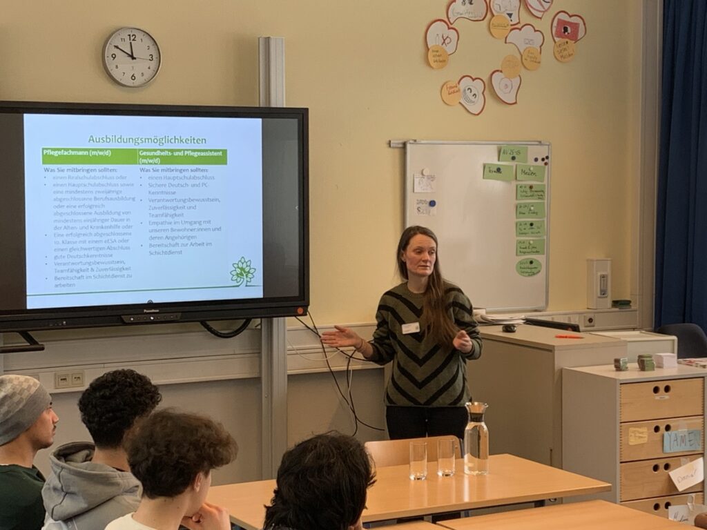 In einer anschaulichen Präsentation erklärte Franka Ehlers, Praxisanleiterin des Unternehmens, welche Aufgaben in den Pflegeberufen anfallen, welche persönlichen Stärken gefragt sind und welche Entwicklungsmöglichkeiten die Pflege bietet. Besonders interessant für viele war, wie vielfältig der Arbeitsalltag in der Pflege ist und wie wichtig Teamarbeit, Empathie und Verantwortungsbewusstsein in diesem Berufsfeld sind.